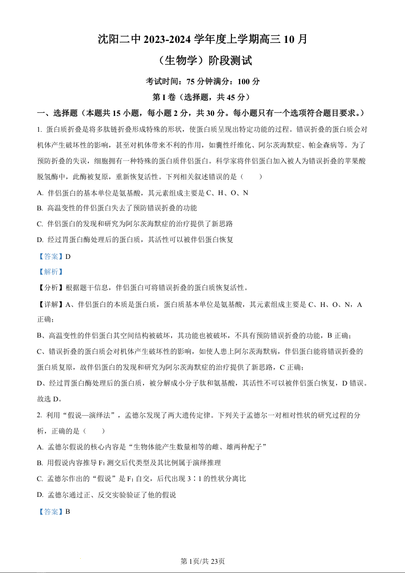辽宁省沈阳市第二中学2023-2024学年高三上学期10月阶段测试 生物答案