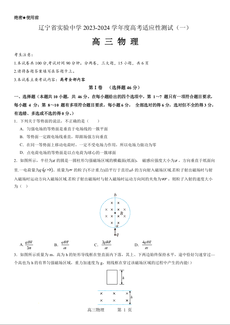 辽宁省实验中学2023-2024学年高三上学期高考适应性测试(一)物理