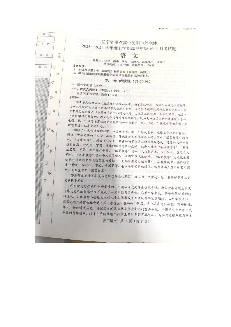 辽宁省重点高中沈阳市郊联体2023-2024学年高三上学期10月月考 语文