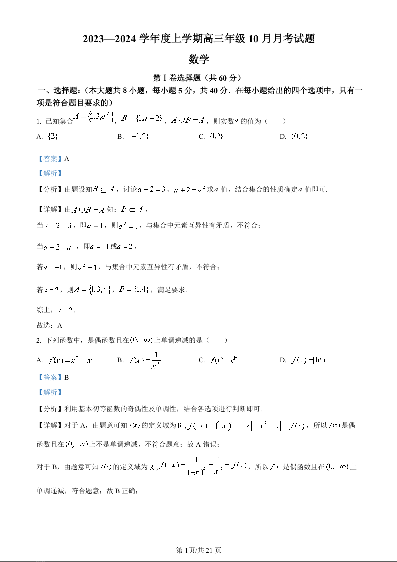 辽宁省重点高中沈阳市郊联体2023-2024学年高三上学期10月月考 数学答案