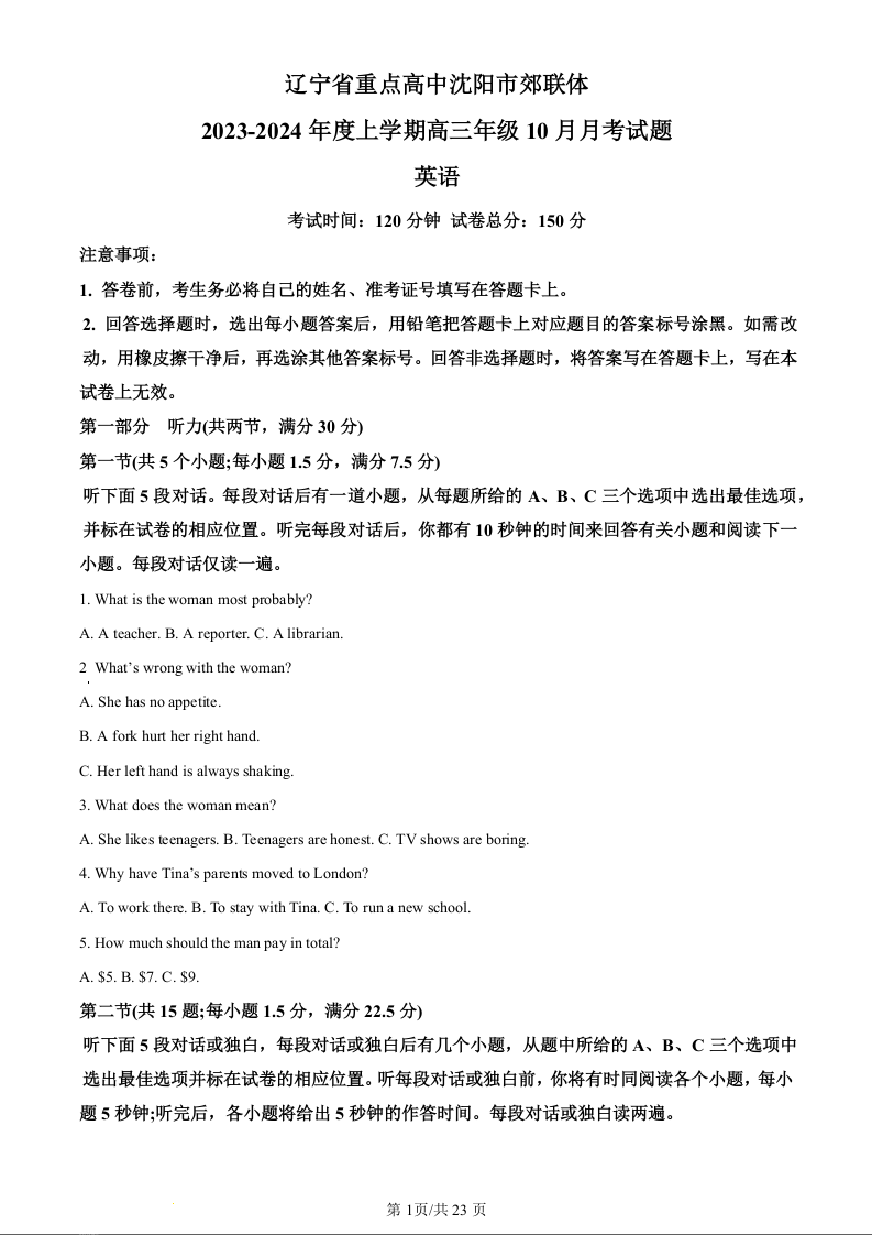 辽宁省重点高中沈阳市郊联体2023-2024学年高三上学期10月月考 英语答案