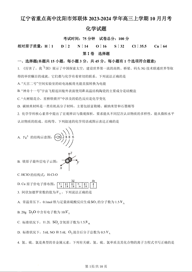 辽宁省重点高中沈阳市郊联体2023-2024学年高三上学期10月月考 化学