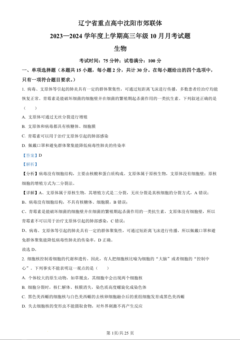 辽宁省重点高中沈阳市郊联体2023-2024学年高三上学期10月月考 生物答案