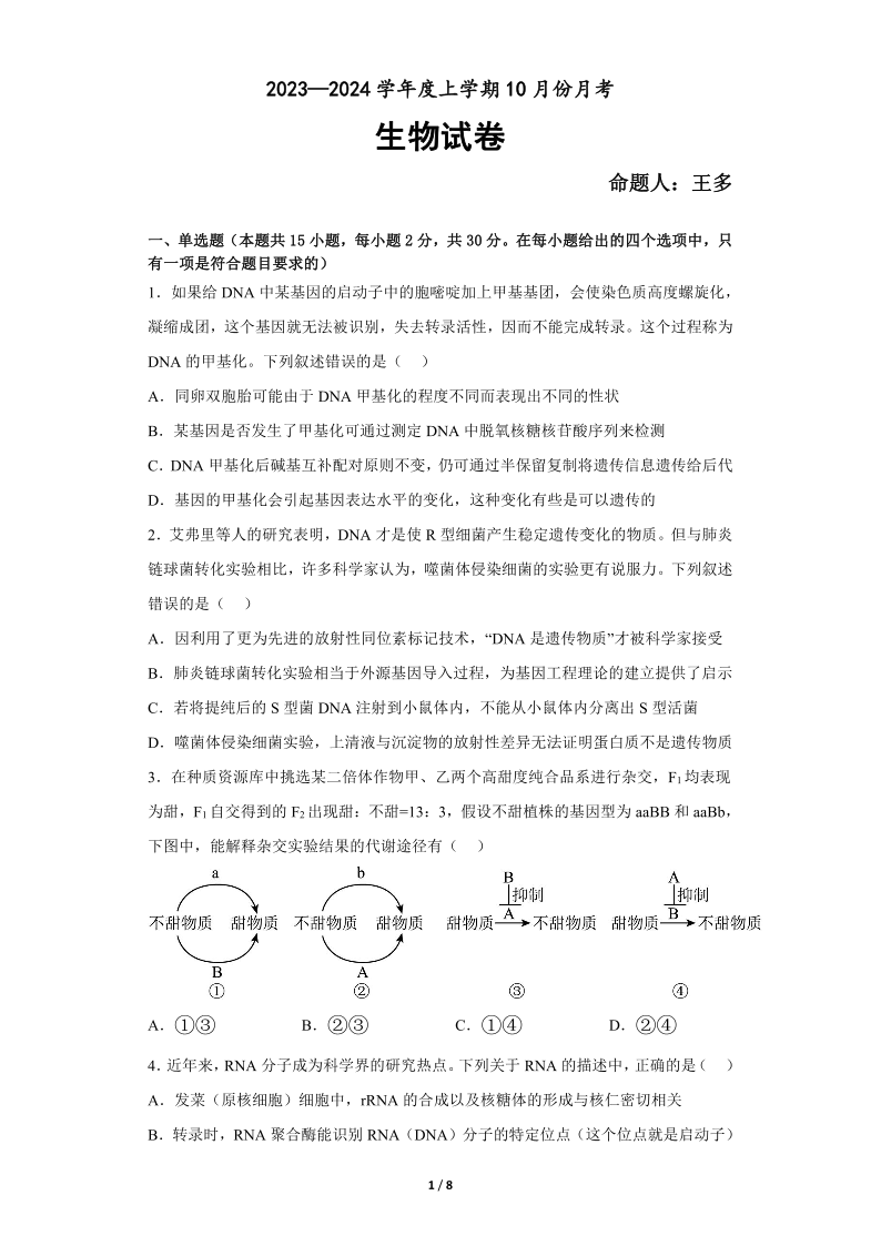 辽宁省新民市高级中学2023-2024学年高三10月月考 生物