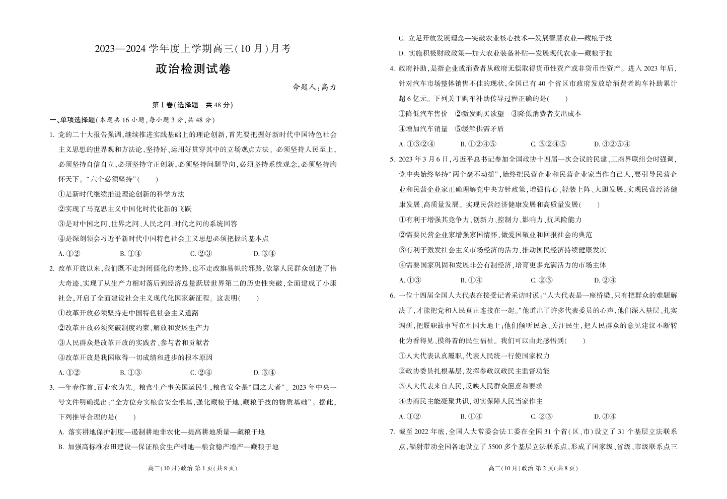 辽宁省新民市高级中学2023-2024学年高三10月月考 政治