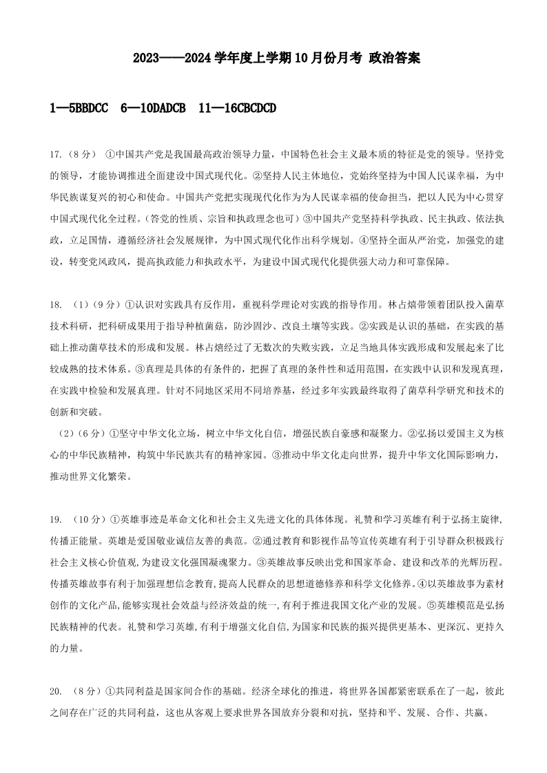 辽宁省新民市高级中学2023-2024学年高三10月月考 政治答案