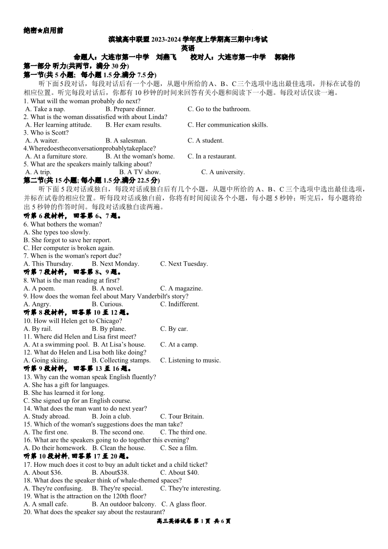 辽宁省大连市滨城高中联盟2023-2024学年高三上学期期中(Ⅰ)考试 英语
