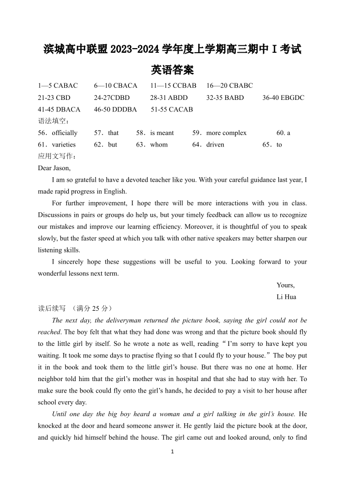 辽宁省大连市滨城高中联盟2023-2024学年高三上学期期中(Ⅰ)考试 英语答案