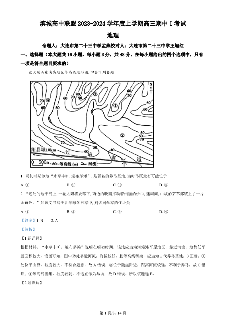 辽宁省大连市滨城高中联盟2023-2024学年高三上学期期中(Ⅰ)考试 地理答案