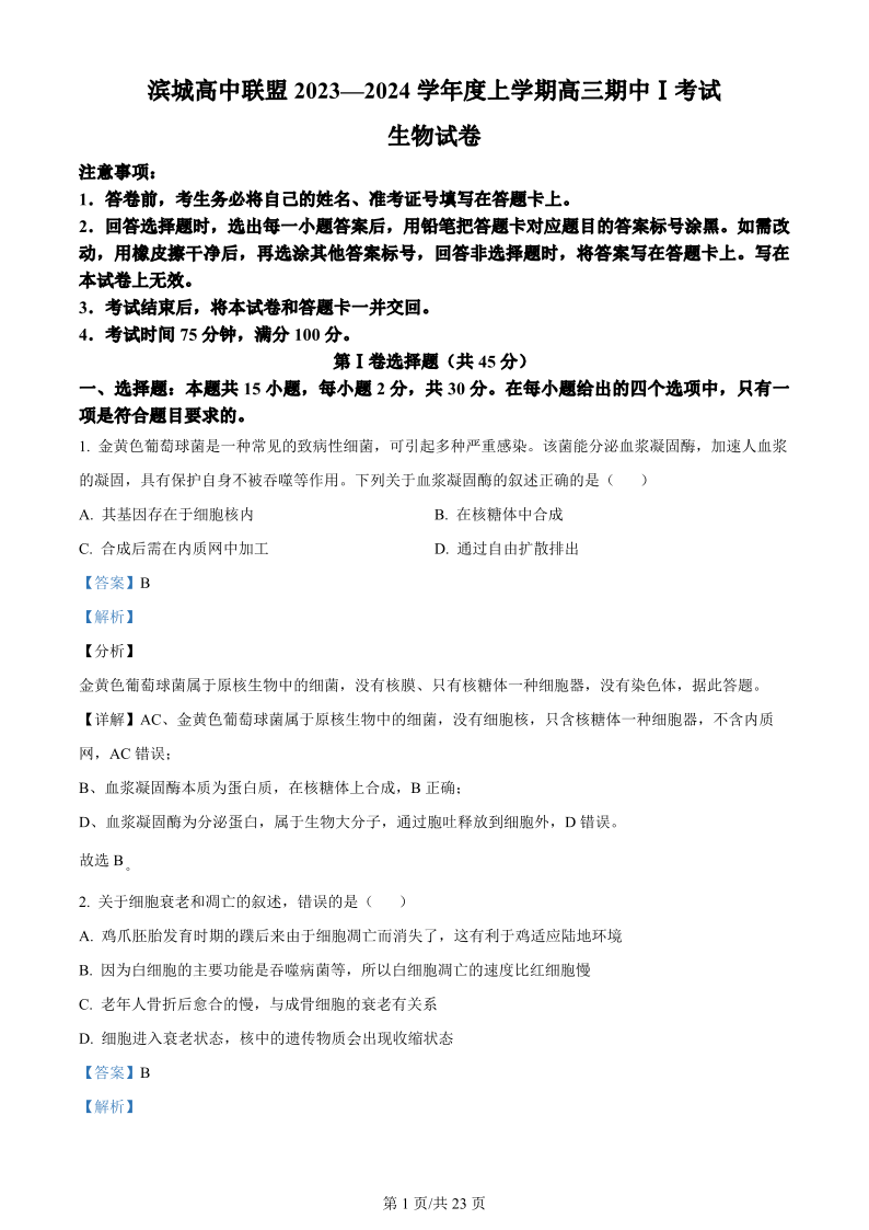辽宁省大连市滨城高中联盟2023-2024学年高三上学期期中(Ⅰ)考试 生物答案