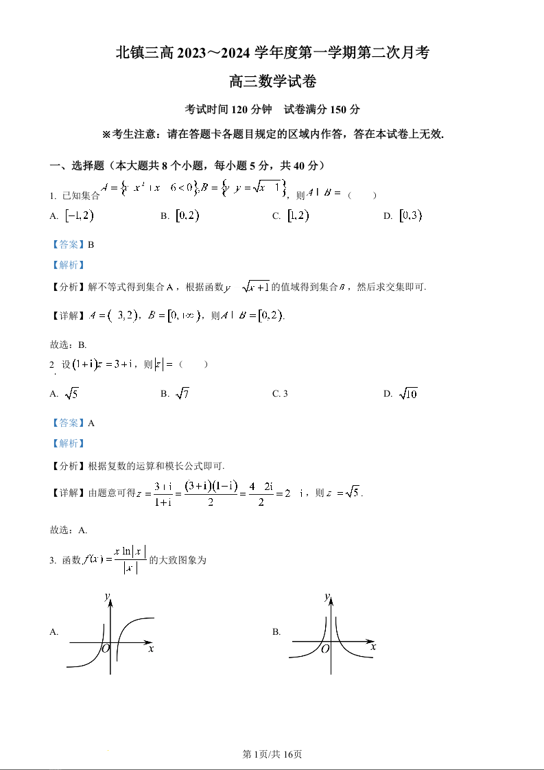 辽宁省北镇市第三高级中学2024届高三上学期第二次月考 数学答案