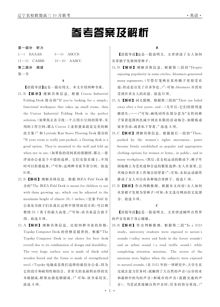 辽宁省名校联盟2023-2024学年高三上学期10月联考 英语答案