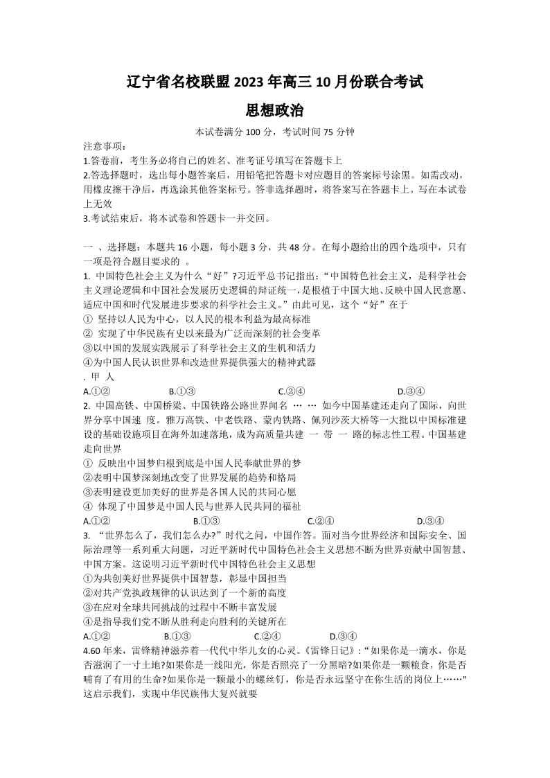 辽宁省名校联盟2023-2024学年高三上学期10月联考 政治