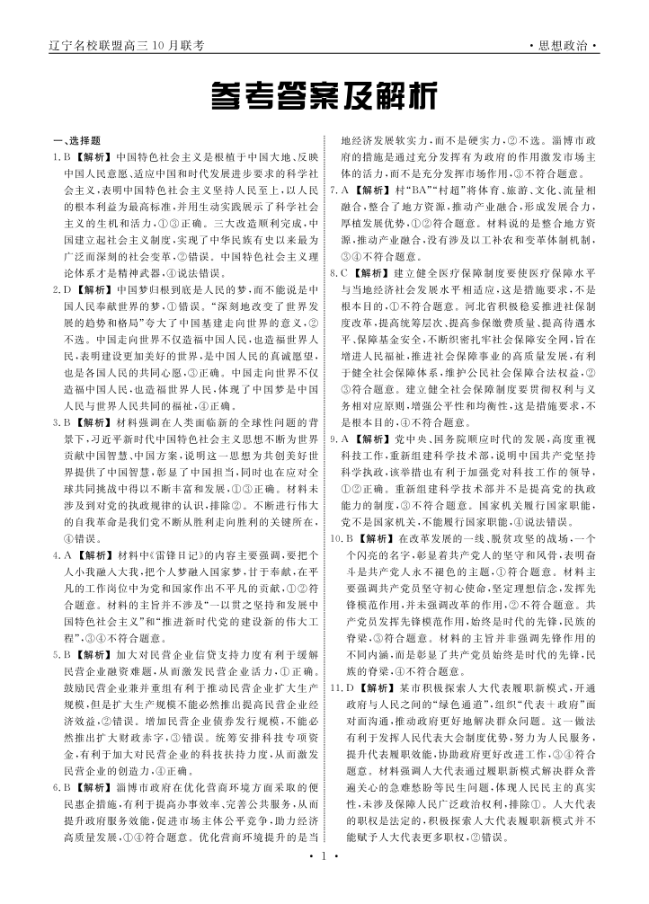 辽宁省名校联盟2023-2024学年高三上学期10月联考 政治答案