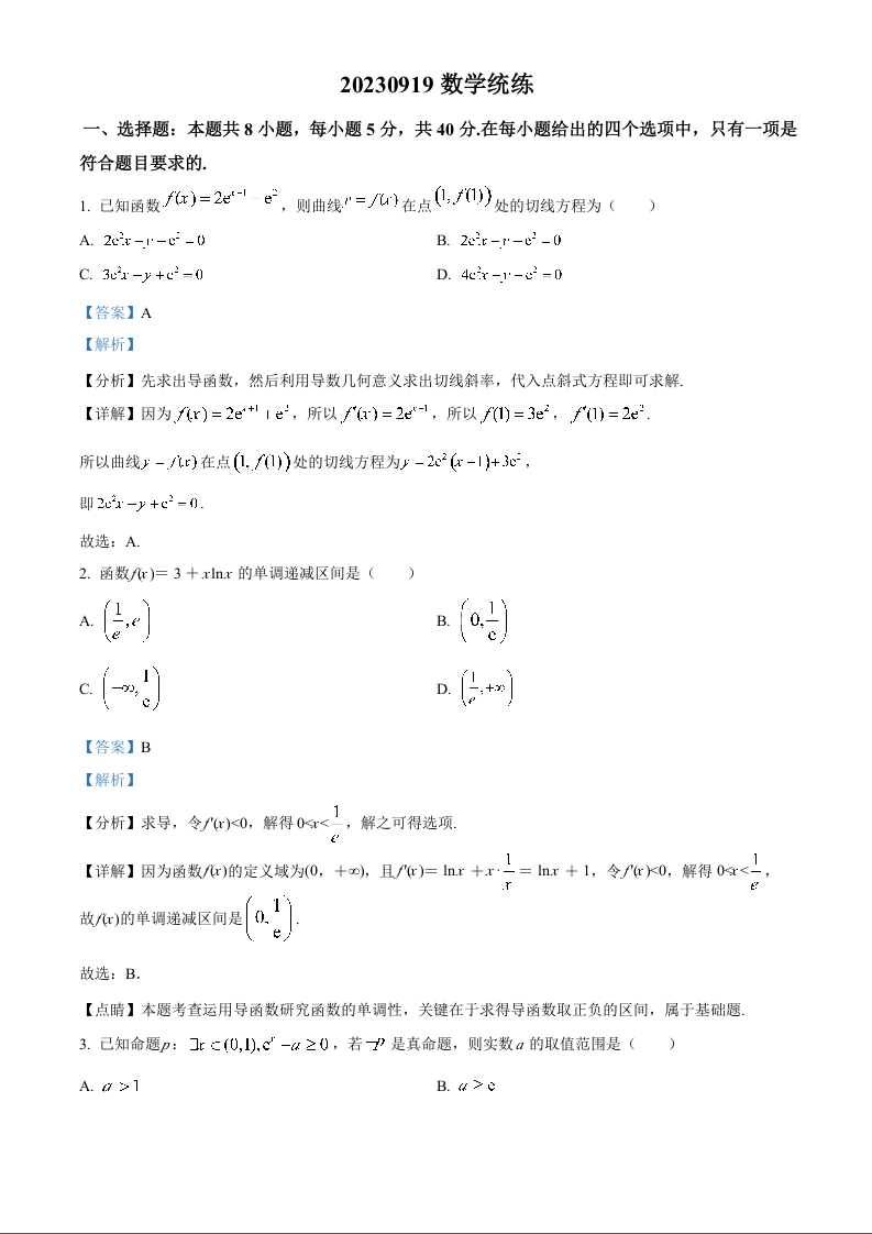 辽宁省大连市第八中学2023-2024学年高三上学期9月月考 数学解析