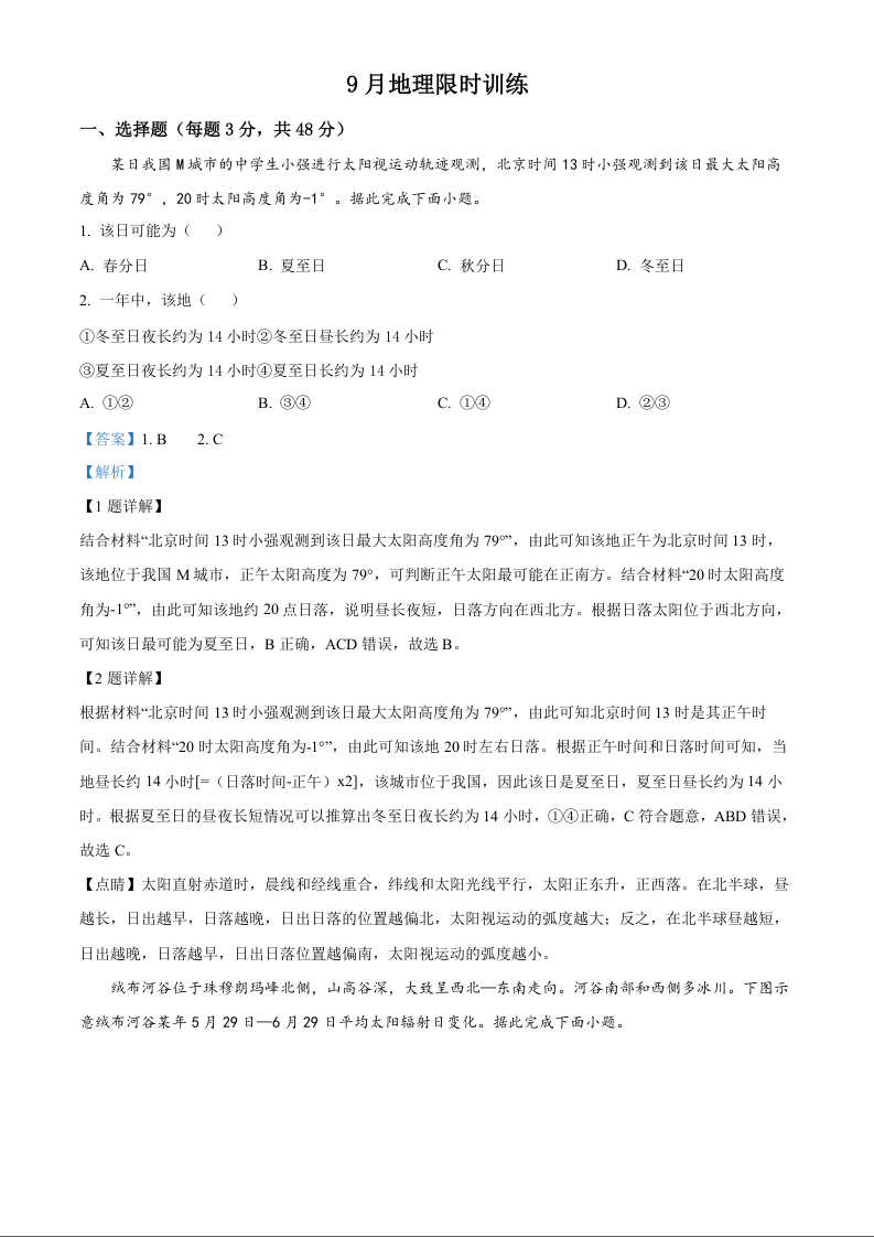 辽宁省大连市第八中学2023-2024学年高三上学期9月月考 地理解析