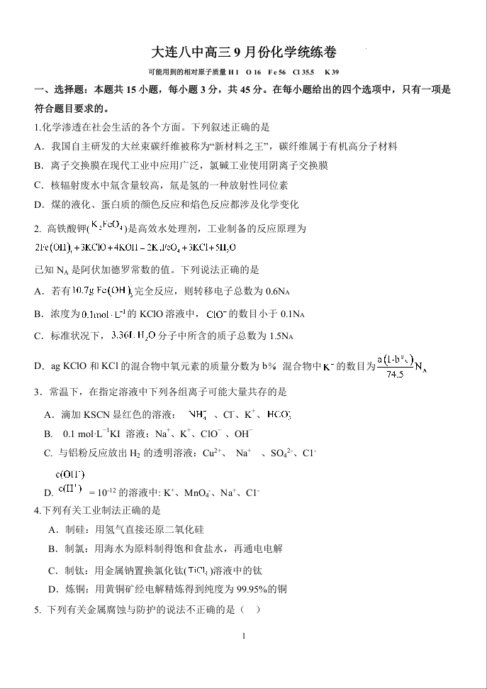 辽宁省大连市第八中学2023-2024学年高三上学期9月月考 化学
