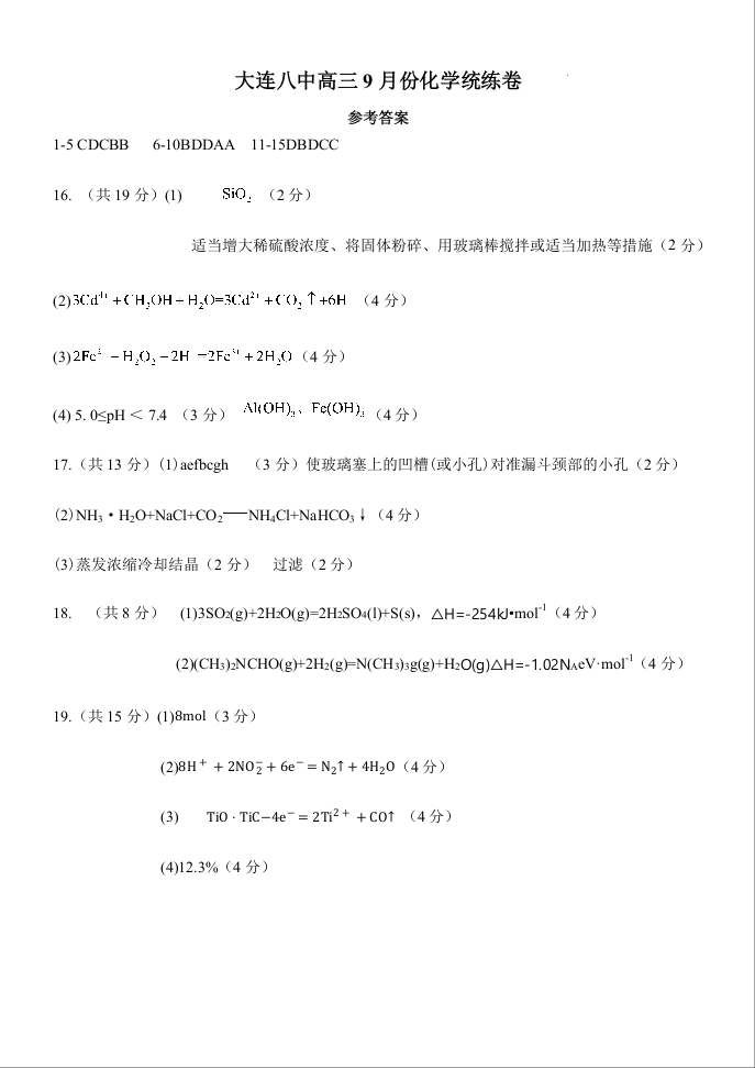 辽宁省大连市第八中学2023-2024学年高三上学期9月月考 化学答案