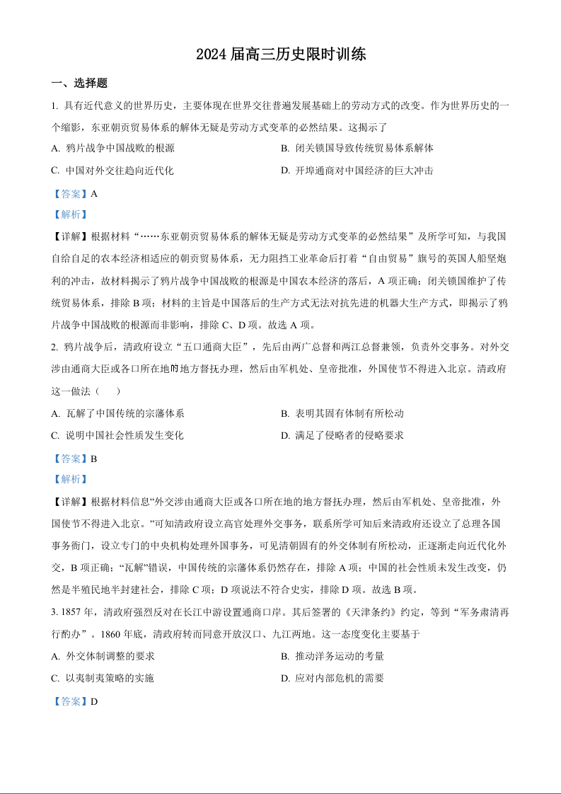辽宁省大连市第八中学2023-2024学年高三上学期9月月考 历史解析