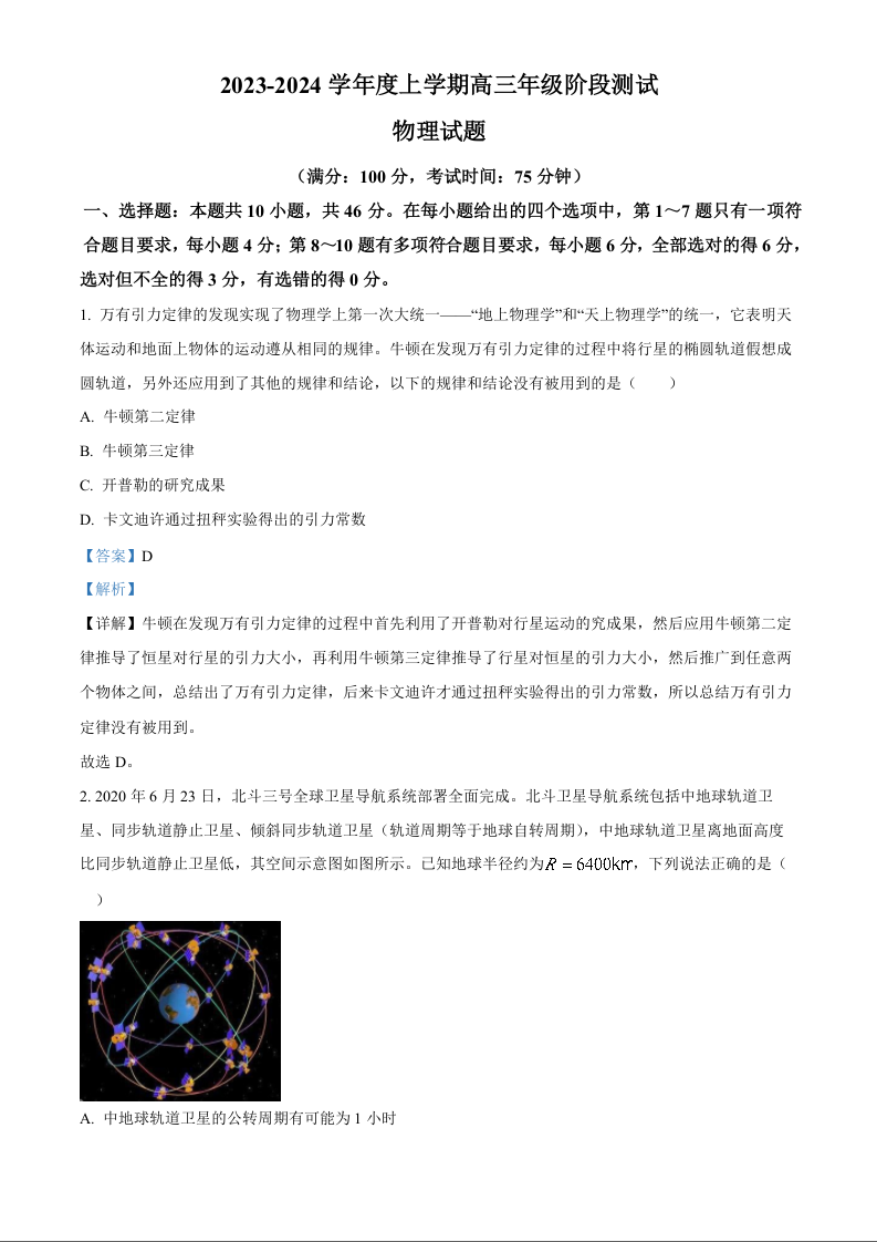 辽宁省大连市第八中学2023-2024学年高三上学期9月月考 物理解析
