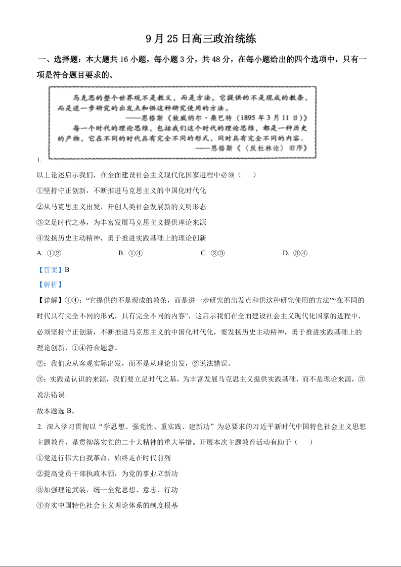 辽宁省大连市第八中学2023-2024学年高三上学期9月月考 政治解析