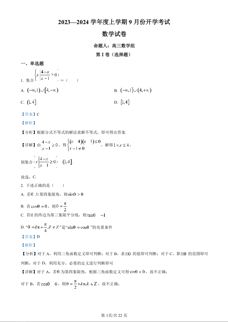 辽宁省沈阳市新民市高级中学2023-2024学年高三上学期9月开学考试 数学解析