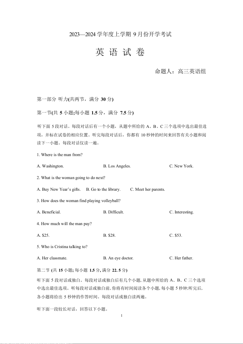 辽宁省沈阳市新民市高级中学2023-2024学年高三上学期9月开学考试 英语