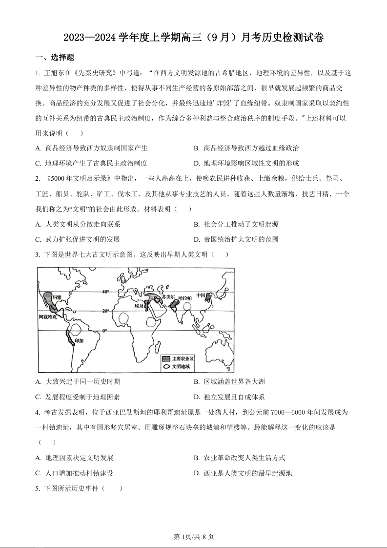 辽宁省沈阳市新民市高级中学2023-2024学年高三上学期9月开学考试 历史