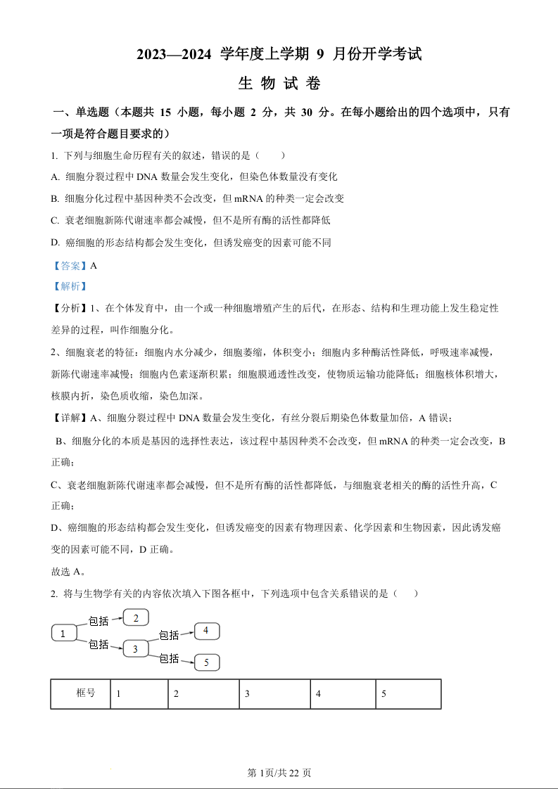 辽宁省沈阳市新民市高级中学2023-2024学年高三上学期9月开学考试 生物解析