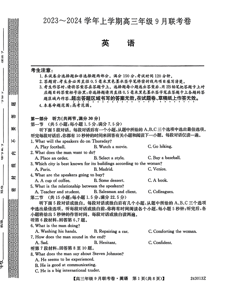 辽宁省名校协作体2023-2024学年高三上学期9月联考 英语