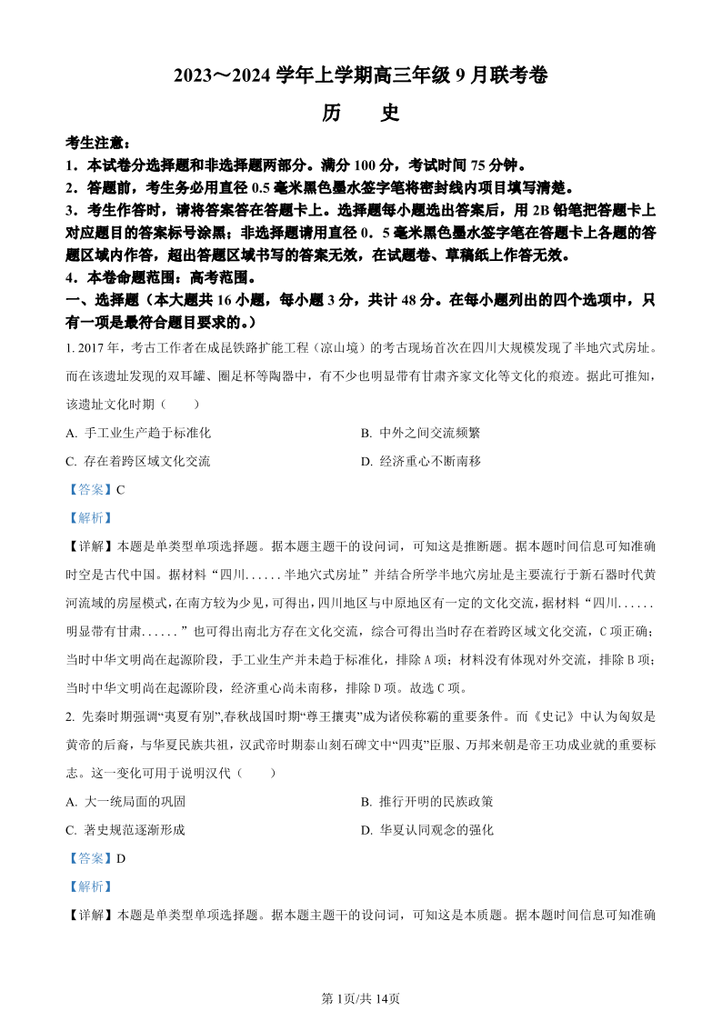 辽宁省名校协作体2023-2024学年高三上学期9月联考 历史答案