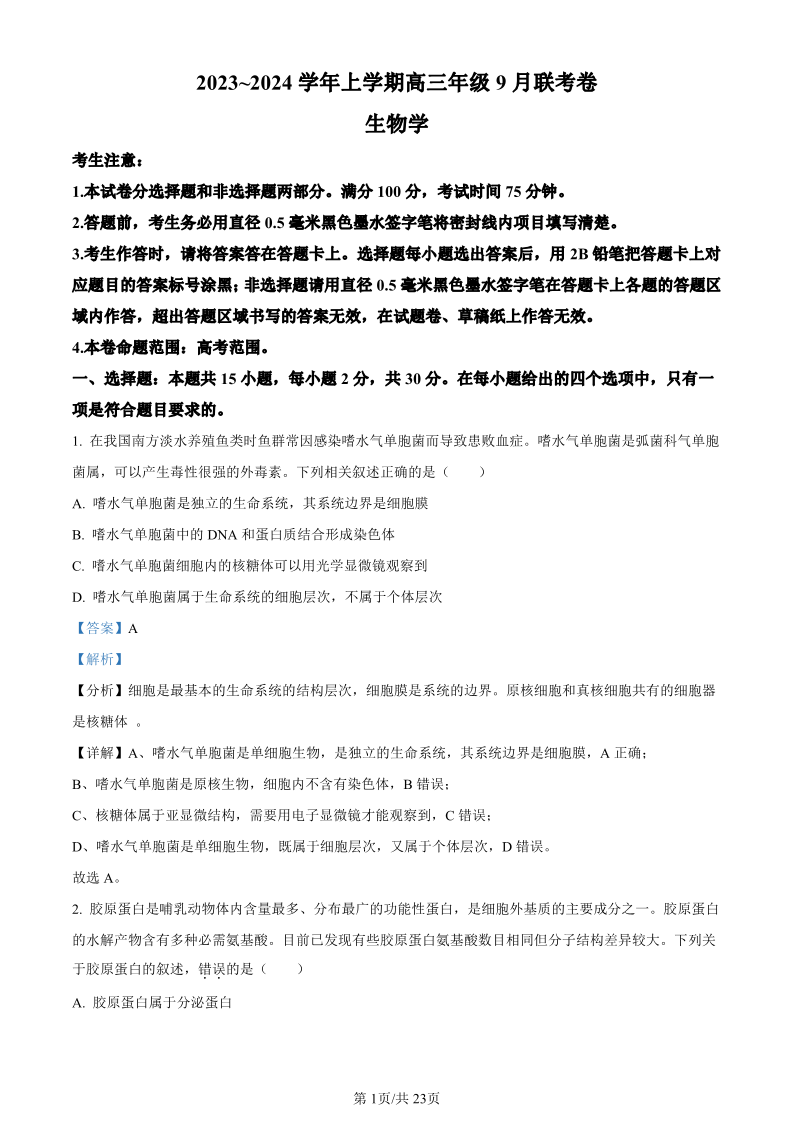 辽宁省名校协作体2023-2024学年高三上学期9月联考 生物答案