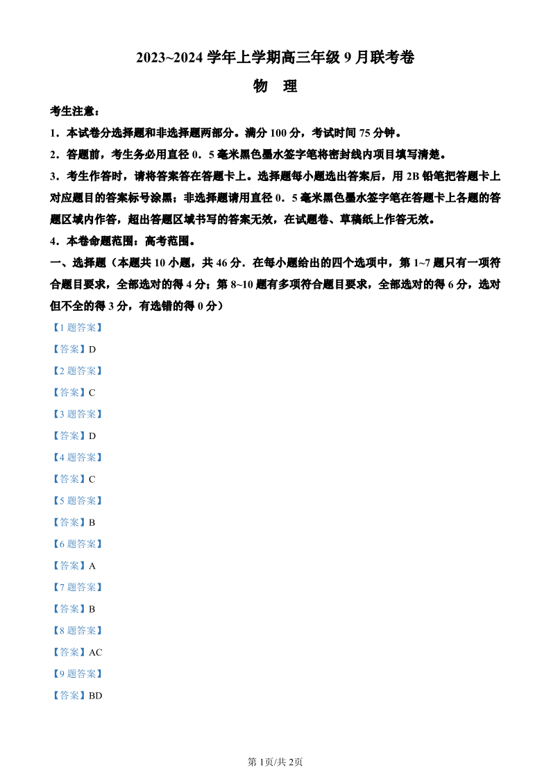 辽宁省名校协作体2023-2024学年高三上学期9月联考 物理答案