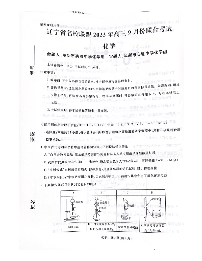 辽宁省名校联盟2023-2024学年高三上学期9月联考 化学
