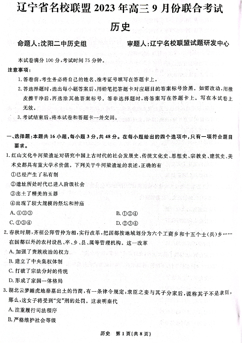 辽宁省名校联盟2023-2024学年高三上学期9月联考 历史