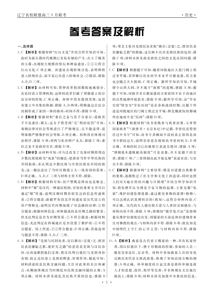 辽宁省名校联盟2023-2024学年高三上学期9月联考 历史答案