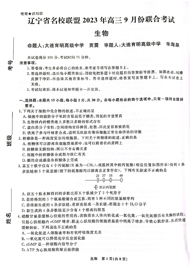 辽宁省名校联盟2023-2024学年高三上学期9月联考 生物