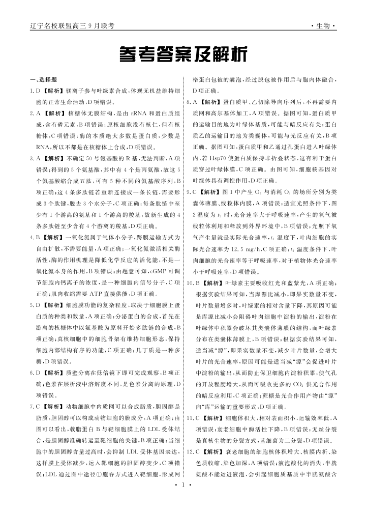 辽宁省名校联盟2023-2024学年高三上学期9月联考 生物答案