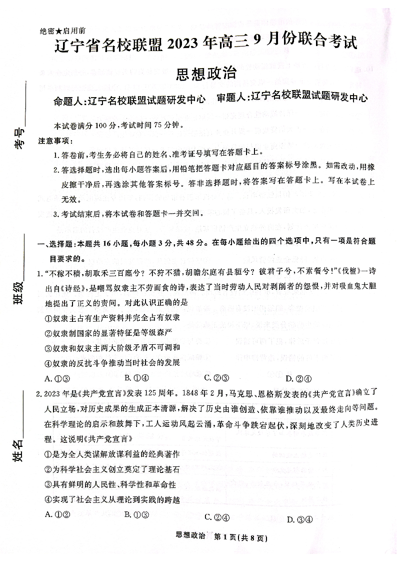 辽宁省名校联盟2023-2024学年高三上学期9月联考 政治