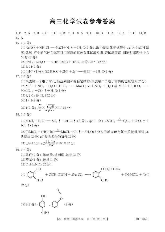 辽宁省部分学校2023-2024学年高三开学摸底考试 化学答案