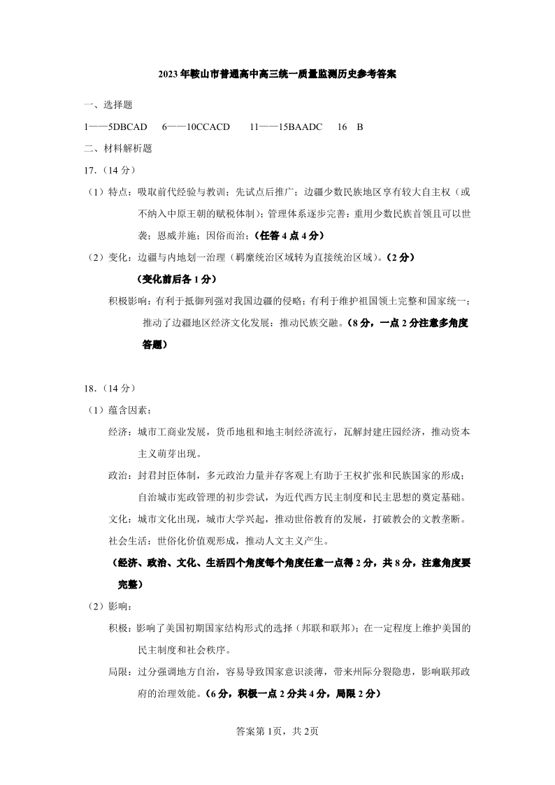 辽宁省鞍山市2023-2024学年高三上学期第一次质量监测 历史答案