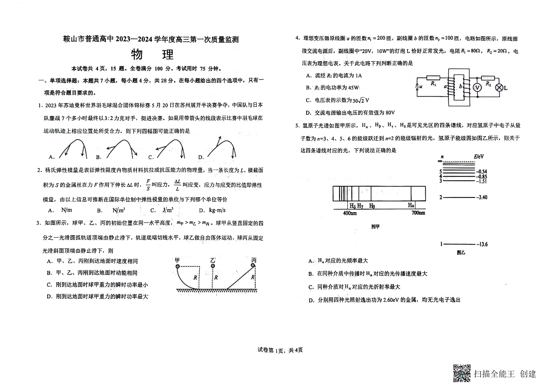 辽宁省鞍山市2023-2024学年高三上学期第一次质量监测 物理
