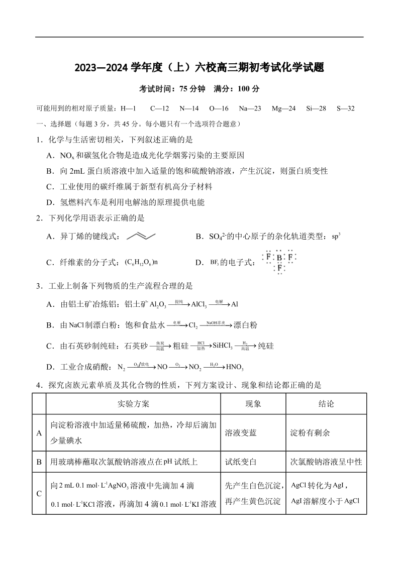 辽宁省六校2023-2024学年高三上学期期初考试 化学