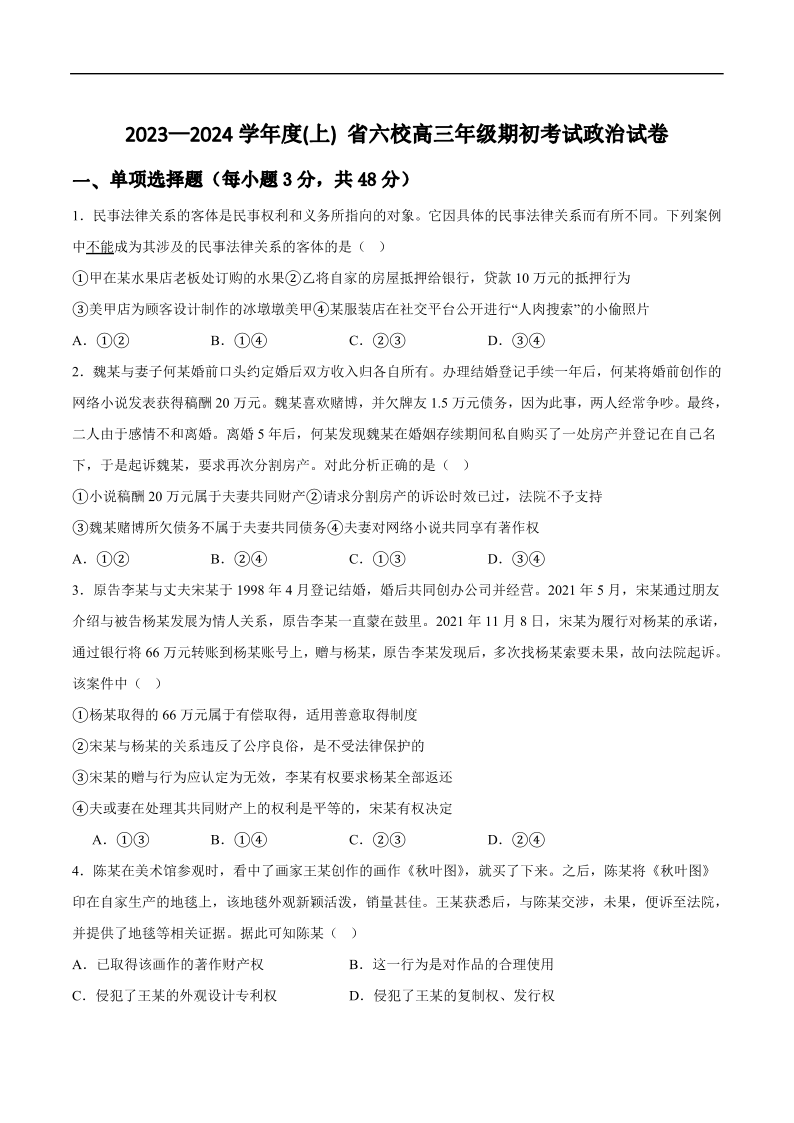 辽宁省六校2023-2024学年高三上学期期初考试 政治