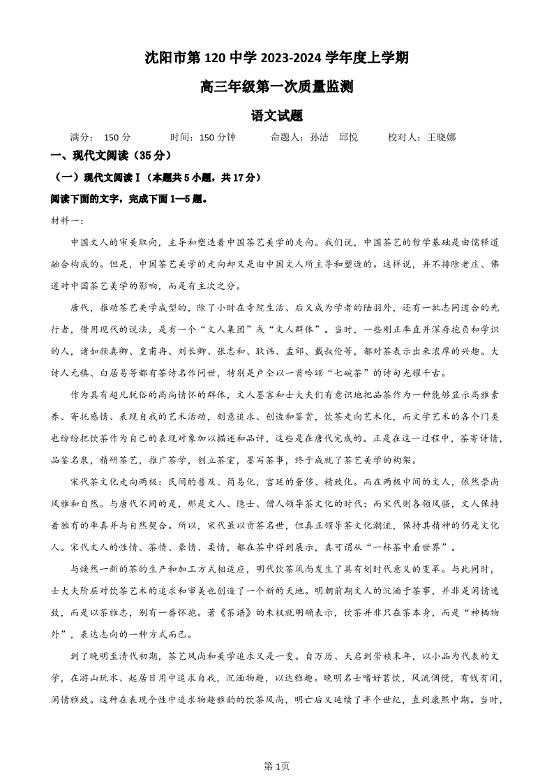 辽宁省沈阳市第一二〇中学2023-2024学年高三上学期第一次质量检测 语文