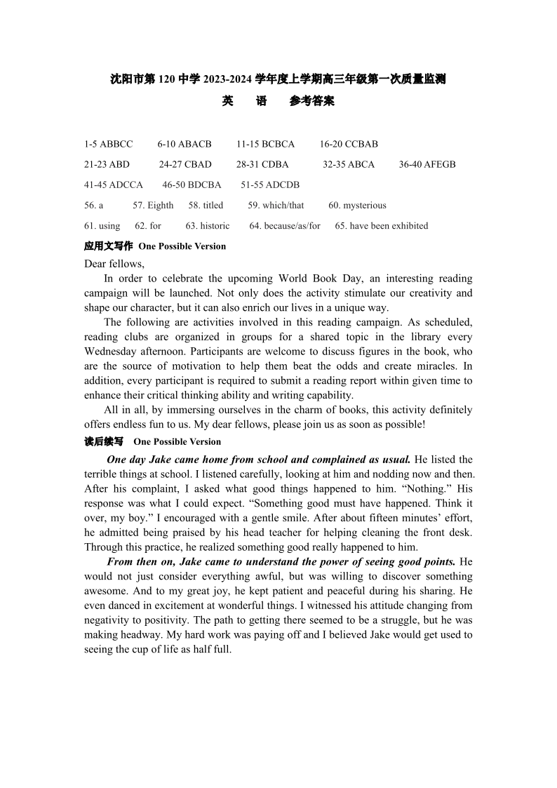 辽宁省沈阳市第一二〇中学2023-2024学年高三上学期第一次质量检测 英语答案
