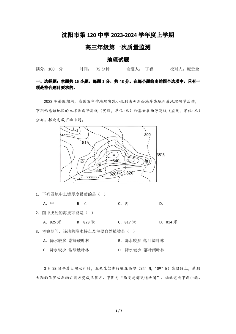 辽宁省沈阳市第一二〇中学2023-2024学年高三上学期第一次质量检测 地理