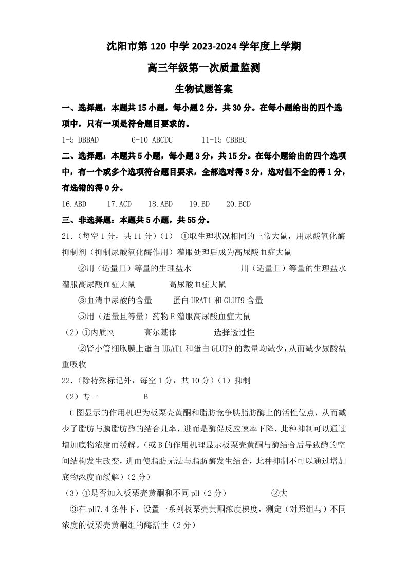 辽宁省沈阳市第一二〇中学2023-2024学年高三上学期第一次质量检测 生物答案