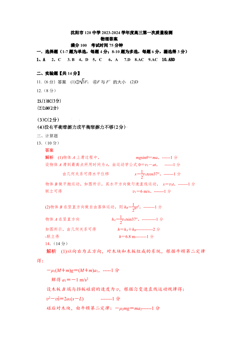 辽宁省沈阳市第一二〇中学2023-2024学年高三上学期第一次质量检测 物理答案