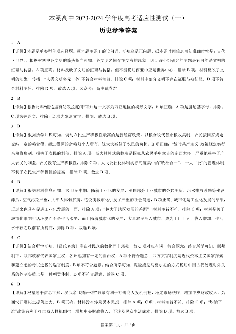 本溪高中2023-2024学年度高考适应性测试(一)历史参考答案